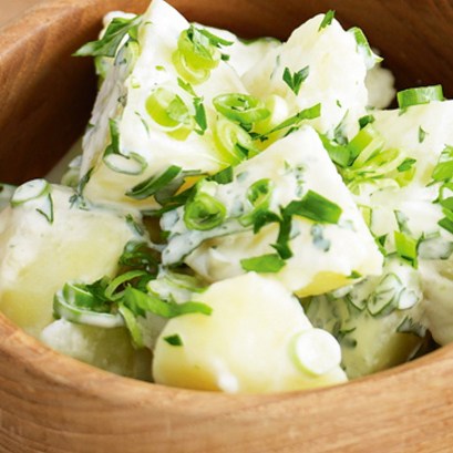 Bring a large pot of salted water to a boil, add the potatoes and let cook until tender. While the potatoes cook, in a large bowl, whisk together the vinegar, sugar, mustard, salt and pepper. Drain the potatoes, stir them into the vinegar mixture and let them marinate for 30 minutes to absorb the flavors. In a small bowl, whisk the mayonnaise, sour cream and heavy cream. Fold this creamy mixture into the potato mixture along with the onions and hard-cooked eggs. Cover and chill before serving if you wish. (This salad keeps for up to 3 days in the refrigerator.)