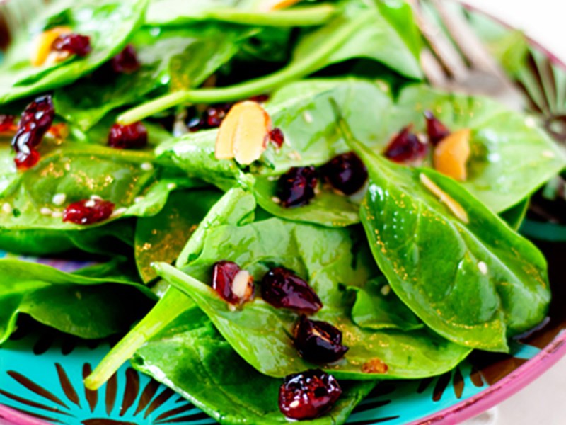 In a large bowl, combine the spinach with the toasted pine nuts, sesame seeds and cranberries.